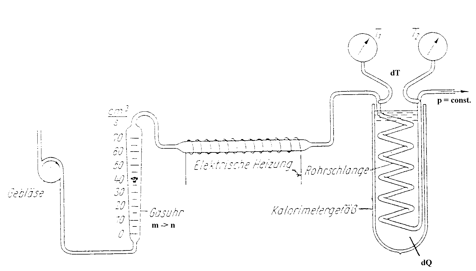 CP läßt sich im strömenden Gas mit einem Versuch nach Pohl messen, indem man es erhitzt und durch eine Rohrwendel in ein Kalorimeter fließen läßt. Aus der Temperaturdifferenz, aus der durchflossenen Gasmenge und aus der im Kalorimeter abgegebenen Energie wird die Molwärme CP bestimmt. Die Berechnung ergibt die Formel