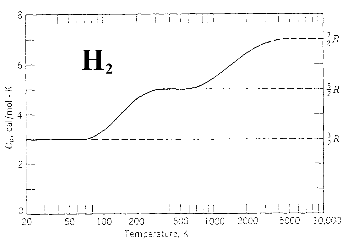 Variation of the molar heat Cr of hydrogen with temerature. Note that T is drawn on a logarithmic scale. Hydrogen dissociates before 3200 K is reached. The dashed curve is for a diatomic molecule that does not dissociate before 10.000 K is reached.