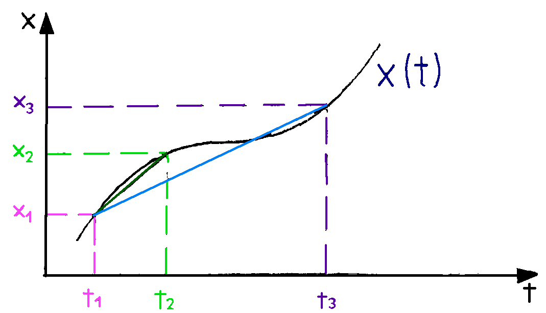 - Die mittlere Geschwindigkeit ist vom Messintervall abhängig. Die mittlere Geschwindigkeit von Punkt x0 nach x3 ist im Allgemeinen verschieden.