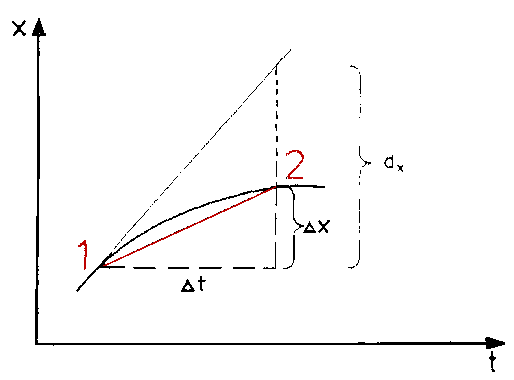 Will man die Geschwindigkeit in einem Punkt berechnen, so muß man zunächst die Streckenintervalle immer weiter verkürzen, bis man ein infinitisimales Intervall betrachten kann. Hierzu bildet man den Grenzwert der Intervalle für eine Zeitdifferenz, die gegen Null strebt.