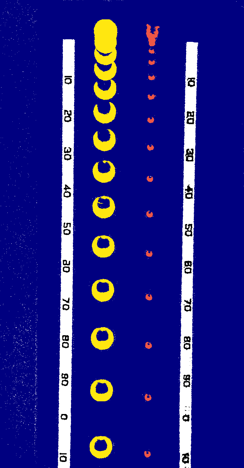 Die nebenstehende Abbildung zeigt eine stroboskopische Aufnahme zweier Kugeln unterschiedlicher Masse und Größe, die zur selben Zeit auf gleicher Höhe losgelassen wurden.