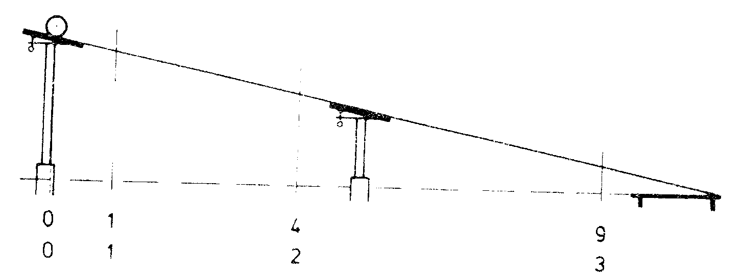 Diesmal können wir, nachdem wir schon berechnet haben, daß das Weg-Zeit-Gesetz quadratisch mit der Zeit verlaufen wird, die Lichtschranken entsprechen in den Abständen 1Längeneinheit (1LE), 4LE, 9LE usw. aufstellen. Jetzt müßten die Zeiten zum Durchlauf der einzelnen Wegstrecken je 1 Zeiteinheit (1 ZE) betragen, die Zeiten gemessen vom Loslaufen bei t = 0 entsprechen t1 = 1ZE, t2= 2ZE, t3 = 3ZE, usw. Bestätigt sich diese Theorie, so ist demonstriert, daß
