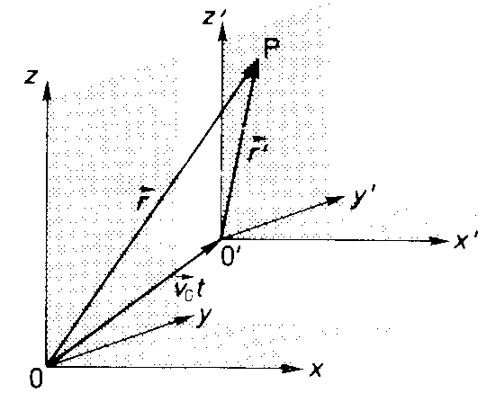 Bisher hatten wir die Einschränkung gemacht, daß die Berechnungen der Bewegungsgleichung nur mit der Beschreibung durch ein ruhendes Bezugssystem Gültigkeit besitzen. Es ist jedoch auch interessant zu fragen, wie man die Bewegung in einem bewegten System beschreiben kann. Als Beispiel stelle man sich einen Menschen vor, der in einem Zug entgegen der Fahrtrichtung geht. In welche Richtung bewegt er sich, und wie sieht diese Bewegung für einen Beobachter im Zug, für einen Beobachter draußen oder sogar für einen Beobachter in einem entgegenkommenden Zug aus ?