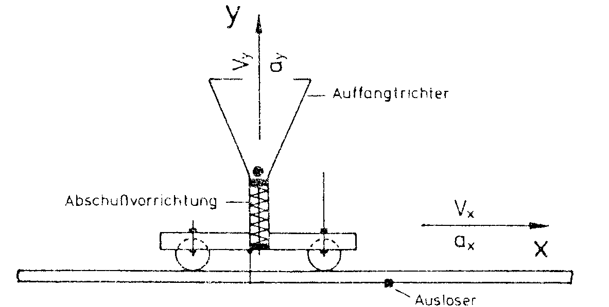 Bei diesem Versuch soll gezeigt werden, wie zwei Körper in verschiedenen (Inertial-)systemen sich bei verschiedenen Bewegungsformen zueinander bewegen. Hierzu wird ein Wagen mit einer Abschußvorrichtung und mit Auffangtrichter senkrecht zur Bodenplatte eine Kugel mit vy und ay abschießen. Sobald die Kugel den Wagen verlassen hat, wirkt auf sie nur noch die Gravitation. Untersucht werden soll, wo die Kugel landet.