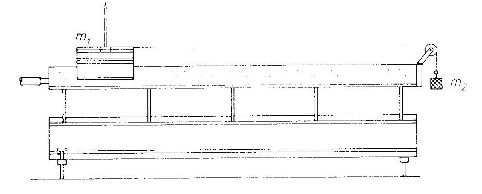 In einem zweiten Versuchsteil mit der Luftkissenbahn konnte die Fallstrecke gemessen werden bei verschiedenen Massen m1 und m2. Die größere Masse m1 ist bei dieser Versuchsanordnung als Reiter auf der Schiene befestigt, eine kleinere Masse m2 erzeugt eine Gewichtskraft. Da die Massen mit einem Faden verbunden sind, ist auch hier die beschleunigte Masse gleich der Gesamtmasse. Gemessen wird die Zeit, die der Reiter braucht, um einen Meter zurückzulegen, nachdem die kleine Masse fallen gelassen wird. Über die Beziehung x = ½ at2 kann a rechnerisch bestimmt werden.