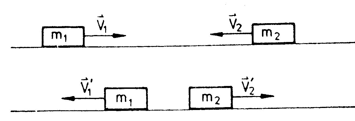 Dieser Versuch wird auf der Luftkissenbahn durchgeführt. Zwei Reiter der Massen m1 und m2 werden mit den Geschwindigkeiten