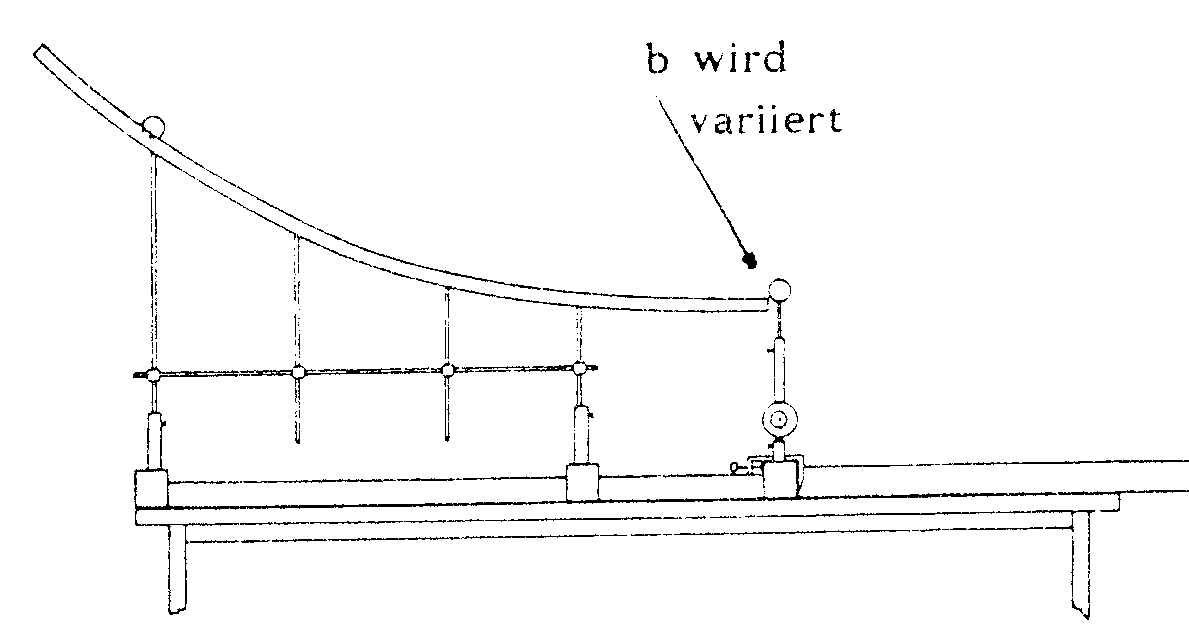 Bei diesem Versuch soll die Geschwindigkeit eines Geschosses aus einem Gewehr berechnet werden. Hierzu schießt man eine Gewehrkugel der Masse m aus einigen Metern Entfernung auf eine Kiste der Masse M. Diese Kiste ist an einem Seil frei schwingend aufgehängt und befindet sich vor dem Einschuß in Ruhe. Trifft das Geschoß die Kiste, so wird diese beschleunigt und schwingt aus. Dabei verschiebt sie einen Markierungsstift, der nach Rückschwingen der Kiste stehen bleibt und so die maximale Auslenkung a der Kiste anzeigt.
