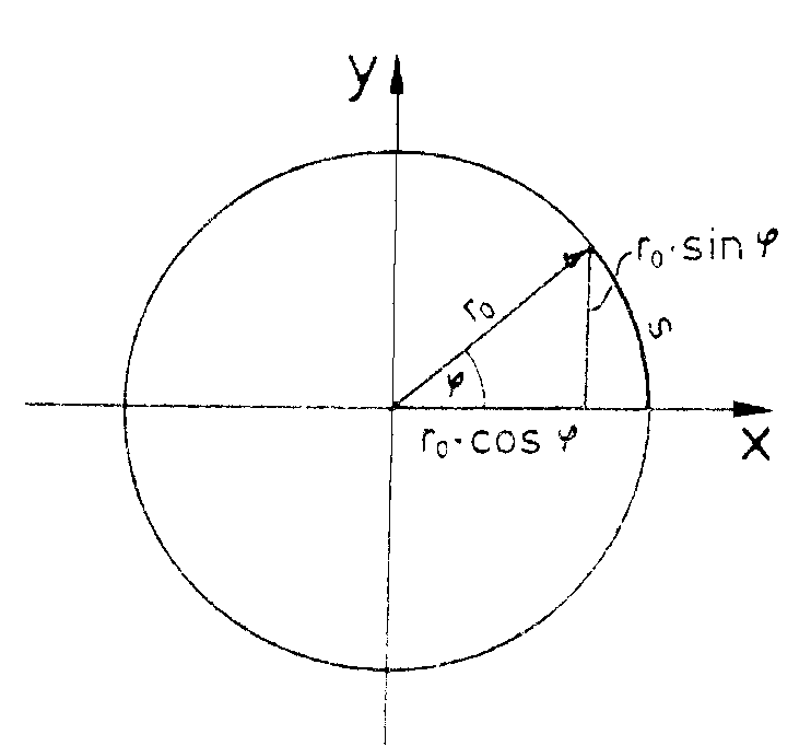,der vom Kreismittelpunkt zu einem beliebigen Punkt auf dem Kreisbogen zeige, in einem karthesischen Koordinatensystem. Zur einfacheren Berechnung liege der Mittelpunkt im Koordinatenursprung. Die Betrachtung des Kreises beinhaltet die Annahme, die Bewegung verlaufe in einer Ebene (wir setzen also z = 0) und die Länge des Radiusvektors sei konstant. Der Vektor läßt sich darstellen durch seine Komponenten in x- und y- Richtung. Die Graphik zeigt, daß die
