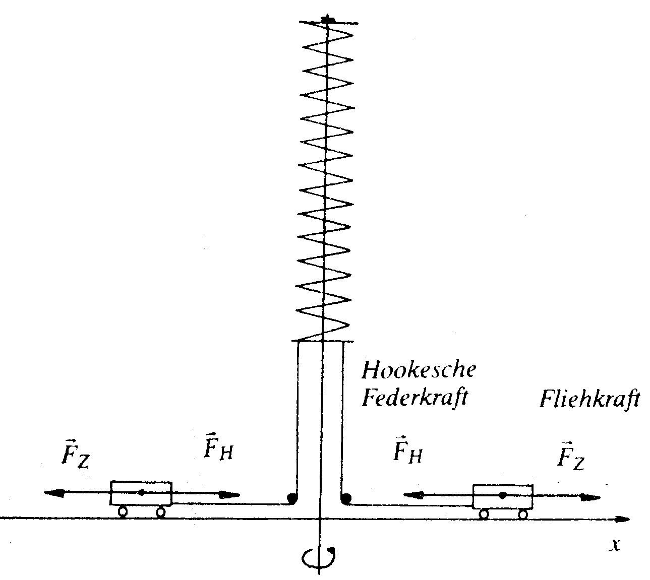 Bei dieser Versuchsanordnung stehen sich zwei Wagen gegenüber auf einer Schiene, auf deren Mitte senkrecht ein Stab befestigt ist, an dessen Ende eine Feder über den Stab herab hängt. Über Umlenkrollen sind die Wagen an die Feder angehängt, sie erfahren also die Federrückstellkraft (Hook'sche Kraft müssen betragsmäßig gleich groß sein, damit die resultierende Kraft null ist und der Körper sich in Ruhe befindet. Mit den bekannten Formeln für die Hook'sche Kraft