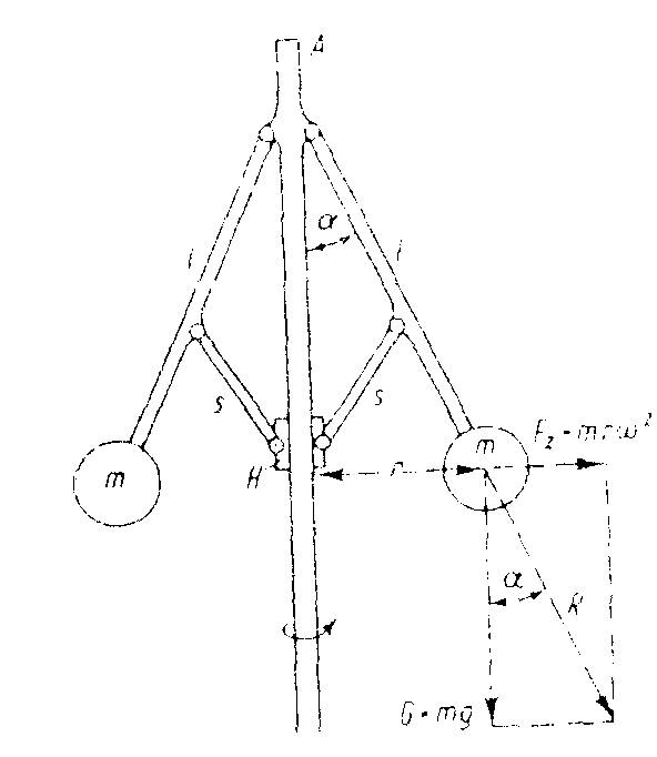 Der Fliehkraftregler besteht aus zwei schweren Kugeln, die über eine Achse in Rotation versetzt werden können. Die Kugeln hängen an Stangen der Länge l, die an der angetriebenen Achse fest montiert sind. Zwei weitere Stangen der Länge s sind so mit der Achse verbunden, daß sie sich auf und ab bewegen lassen, wobei sie an den Kugeln festsitzen. In Rotation versetzt heben sich die Kugeln und damit das untere Gestänge bis zu einer bestimmten Höhe, bei der ein mit den Kugeln verbundener Leiter sich so weit nach oben bewegt, daß er den Kontakt zu seinem Stromkreis verliert und ihn somit durchtrennt. In diesem Stromkreis hängt auch der Antrieb der Achse, so daß die Kugeln nicht mehr rotieren und sinken. Der Kontakt ist wieder hergestellt und die Kugeln heben sich wieder. Die ausgestellten Stangen bilden mit der Achse den Winkel a , die Kugeln seien den Abstand r von der Achse entfernt..