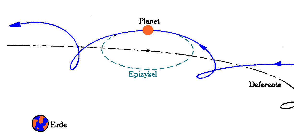 Beobachtete Abweichungen von der Kreisbahn, wie die des Mars, versuchte Ptolomäus um 150 n. Chr. durch Zusatzannahmen zu deuten. Er behauptete, durch Überlagerung einer kleineren Kreisbahn des Planeten mit der großen Kreisbahn um die Erde entstünden die zu beobachteten Epizyklen. Dieses System, das bis in die Neuzeit Gültigkeit besaß, wird heutegeozentrisches, ptolomäisches Weltbild genannt.