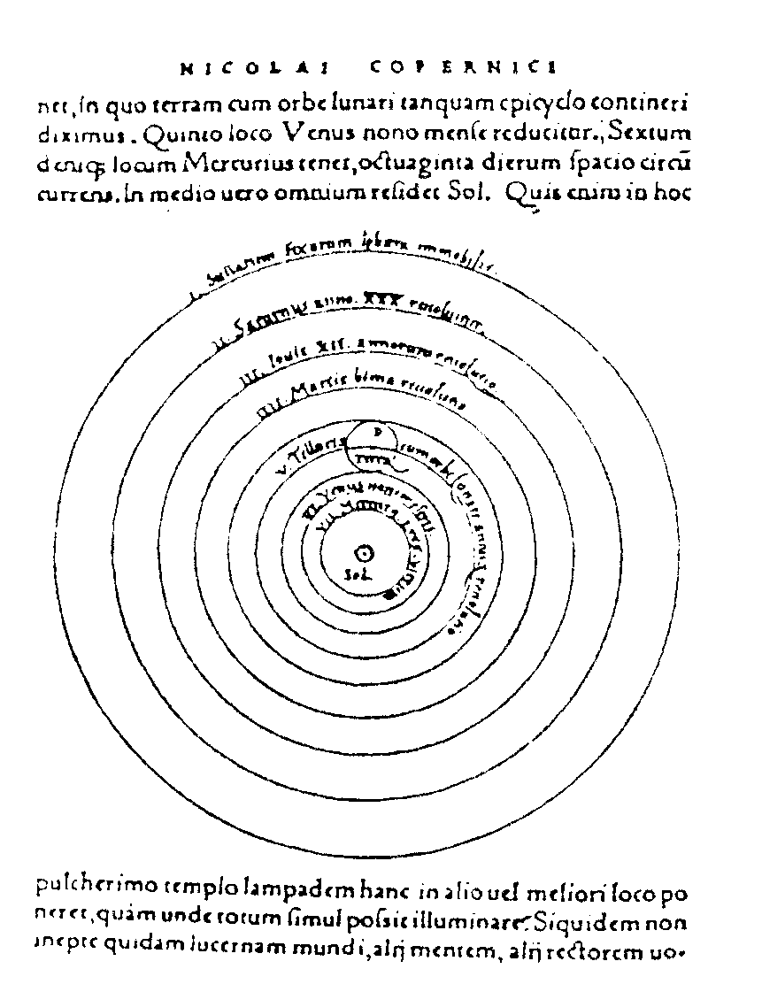 Dieser Theorie widersprachen erst Kopernikus (1473 - 1543 n. Chr.) und Galilei, dennoch gingen beide von Platetenbewegungen auf Kreisbahnen aus. Dem geozentrischen Weltbild widersprach Kopernikus als erster, als er in seinem Werk "De revolutionibus orbium coelestium" 1542 die Hypothesen aufstellte, die Erde drehe sich täglich einmal um die eigene Achse und dadurch erscheinen die Bewegungen der Planeten und die Erde bewege sich um die Sonne. Dieses Weltbild wird heliozentrisches Weltbild genannt. Durch das Beharren auf die Kreisbahnen der Planeten erforderte die Beschreibung der Beobachtungen auch nach der Kopernikanischen Wende noch die komplizierten Hilfsbewegungen.