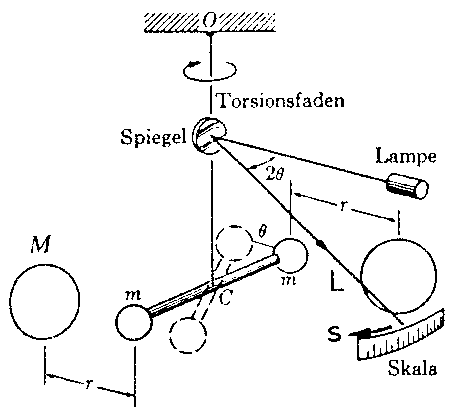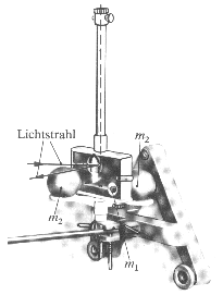 Diese Überlegung macht sich der Engländer Cavendish (1731 - 1810) zunutze. Er erfand 1798 einen Versuch, bei dem die wirkende Gravitationskraft auf eine zweite Weise, über die daraus resultierende Bewegung der Massen, berechnet werden kann. Die so ermittelte Kraft kann dann in das Newtonsche Gravitationsgesetz eingesetzt werden und die Konstante g kann mit Kenntnis der anderen Faktoren berechnet werden.