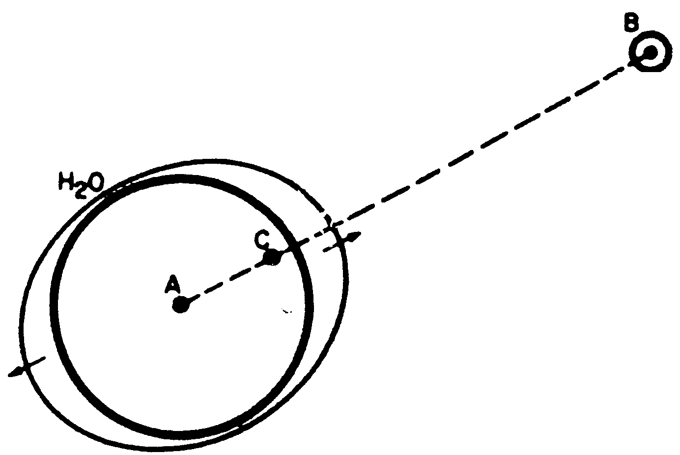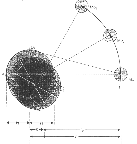 Aus der Mondmasse und dem Abstand vom Mond zur Erdmitte, r = 60 Erdradien, berechnet sich die Fliehkraft. Nun ist der mondnächste Punkt vom Mondmittelpunkt einen Erdradius weniger entfernt, also nur 59 Erdradien. Ein in diesem Punkt frei bewegliches Wasserteilen erfährt nach dem Gravitationsgesetz durch die Mondanziehung die um den Faktor (60/59)2 größere Gravitationskraft. Das Wasserteilchen wird also durch den Differenzbetrag der beiden Kräfte stärker zum Mond hin beschleunigt als der starre Erdkörper. In diesem Punkt bildet sich ein dem Mond zugewandter Flutberg. Ein auf der Erdkugel genau gegenüberliegendes Teilchen ist 61 Erdradien vom Mond entfernt und erfährt deshalb die kleinere Beschleunigung. Es bleibt hinter der Erde zurück, da es vom Mond weniger stark beschleunigt wird. So bildet sich in diesem Punkt ein vom Mond angewandter Flutberg aus. Unter beiden Flutbergen dreht sich die Erde im Laufe von 24 Stunden und 50 Minuten einmal durch (der Mond bleibt täglich etwa 50 Minuten hinter der Sonne zurück).