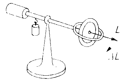 Der wesentliche Aspekt dieses Kreisels liegt darin, daß er ein kräftefreier Kreisel ist. Zunächst hatten wir alle Stangen im rechten Winkel zueinander eingestellt und das Rad angedreht. Die Stange konnte danach frei im Raum ausgerichtet werden, ohne daß sie wieder in die Ausgangslage zurückfiel. Hängt man ein weiteres Gewichtsstück an das dem Rad gegenüberliegende Ende der Stange, so beginnt die Stange sich in Horizontalebene zu drehen. Jetzt wollen wir zudem dem äußeren Ende der Stange gegenüberliegend vom Kreisel einen kräftigen aber kurzen Schlag nach unten versetzen. Nach dem Satz der Erhaltung des Drehimpulses für kräftefreie Kreisel bleibt der Drehimpuls frei im Raum erhalten.
