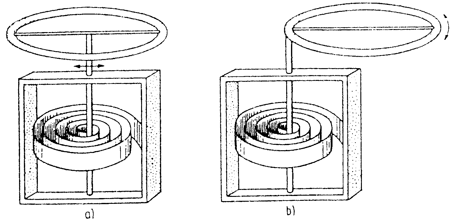 In Kapitel IV hatten wir uns mit Schwingungen beschäftigt. Wir hatten festgestellt, daß Schwingungsdauern auf verschiedene Weisen sehr genau gemessen werden können. Ein Beispiel war die Federschwingung. Nun wollen wir die Schwingung betrachten, die durch Spiralfedern hervorgerufen werden können. Bisher konnten wir alle Erkenntnisse über Rotation durch Übertragen der aus der Translation bekannten Ergebnisse gewinnen. Deshalb vergleichen wir auch hier einmal die lineare Federschwingung mit der Schwingung einer Spiralfeder.