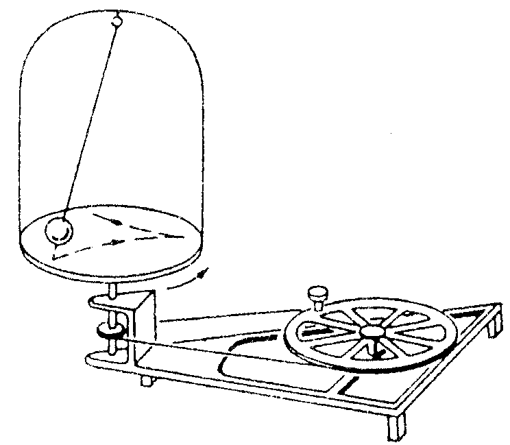 Ein anderer Nachweis zur Erdrotation ist der Foucaultsche Pendelversuch. Grundprinzip dieses Versuches ist es, mit einem einfachen Pendel die Erdrotation nachzuweisen. Dabei schwingt ein Pendel von einem Aufhängepunkt A in einer Pendelebene senkrecht zum Boden. Durch die Erdrotation dreht sich der Boden unter dem Pendel weg, dessen Ausrichtung senkrecht zum Fixsternhimmel erhalten bleibt, da es keine Kräfte gibt, die senkrecht zur Pendelebene auf das Pendel wirken.Um den Versuch quantitativ auswerten zu können, wird in der Gleichgewichtslage des Pendels der Faden über eine optische Anordnung vergrößert an die Wand projiziert. Dann lenkt man das Pendel aus und justiert es so, daß das Bild des Fadens wieder exakt denselben Strich darstellt. So ist die Pendelebene senkrecht zum Boden und senkrecht zur Wand justiert. Läßt man nun das Pendel schwingen, dreht sich für die mitbewegten Beobachter die Pendelebene im Uhrzeigersinn und ist dann nicht mehr senkrecht zur Wand. Tatsächlich kann man das Bild des Fadens schon nach wenigen Schwingungen deutlich die Wand entlang wandern sehen.