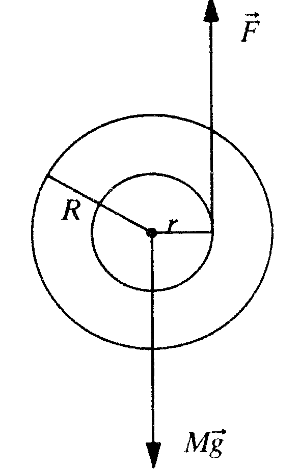 greift an einem Punkt, der um den kleinen Radius vom Schwerpunkt entfernt liegt, senkrecht nach oben an.