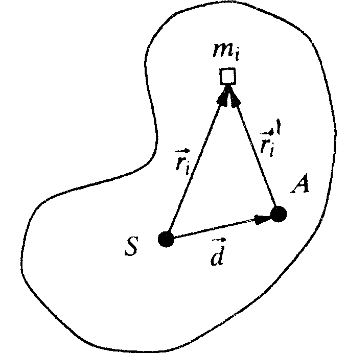 Gegeben sei das Trägheitsmoment um die Symmetrieachse S. Gesucht ist das Trägheitsmoment um die dazu parallele Achse A. In der Skizze sind die Radiusvektoren eines Massepunktes m von den Achsen eingezeichnet.