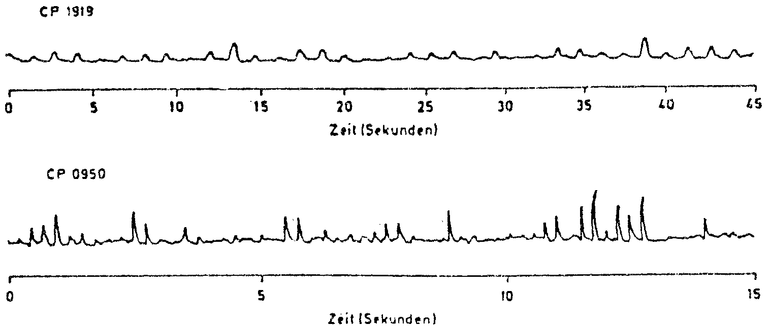 Erste Meßprotokolle von Radiosignalen der Pulsare CP 1919 und CP 0950 (1967). Die sehr schwachen Signale schwanken durch den Einfluß interstellarer Wolken geladener Teilchen in ihrer Intensität. Trotzdem ist der konstante Pulsabstand der Signale deutlich zu erkennen, der für CP 1919 etwa 1,3 sec, für CP 0950 etwa 0,25 sec beträgt. (Aus Scientific American 219, 1968)