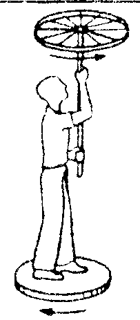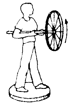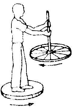 Zunächst hält die Person das Rad senkrecht nach oben, d.h. mit der Achse parallel zum Oberkörper. Das Rad dreht sich weiter, die Person beginnt jedoch, sich auf dem Schemel entgegen der Drehrichtung des Rades zu drehen.