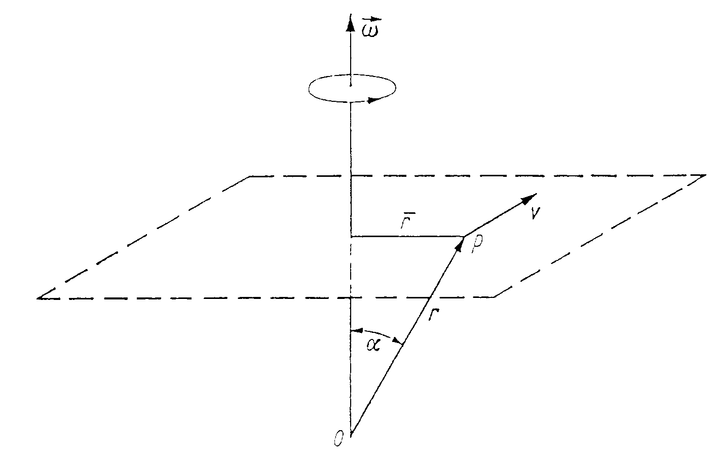 Beschreibt ein Massenpunkt bei einer Drehung einen Kreis mit dem Radius , so hat der Vektor der Winkelgeschwindigkeit die Richtung der Normalen zur Kreisbahnebene mit der Pfeilspitze so, daß sich eine Rechtsschraube ergibt. Ist der Ortsvektor des Massenpunktes von 0 aus, so gilt :