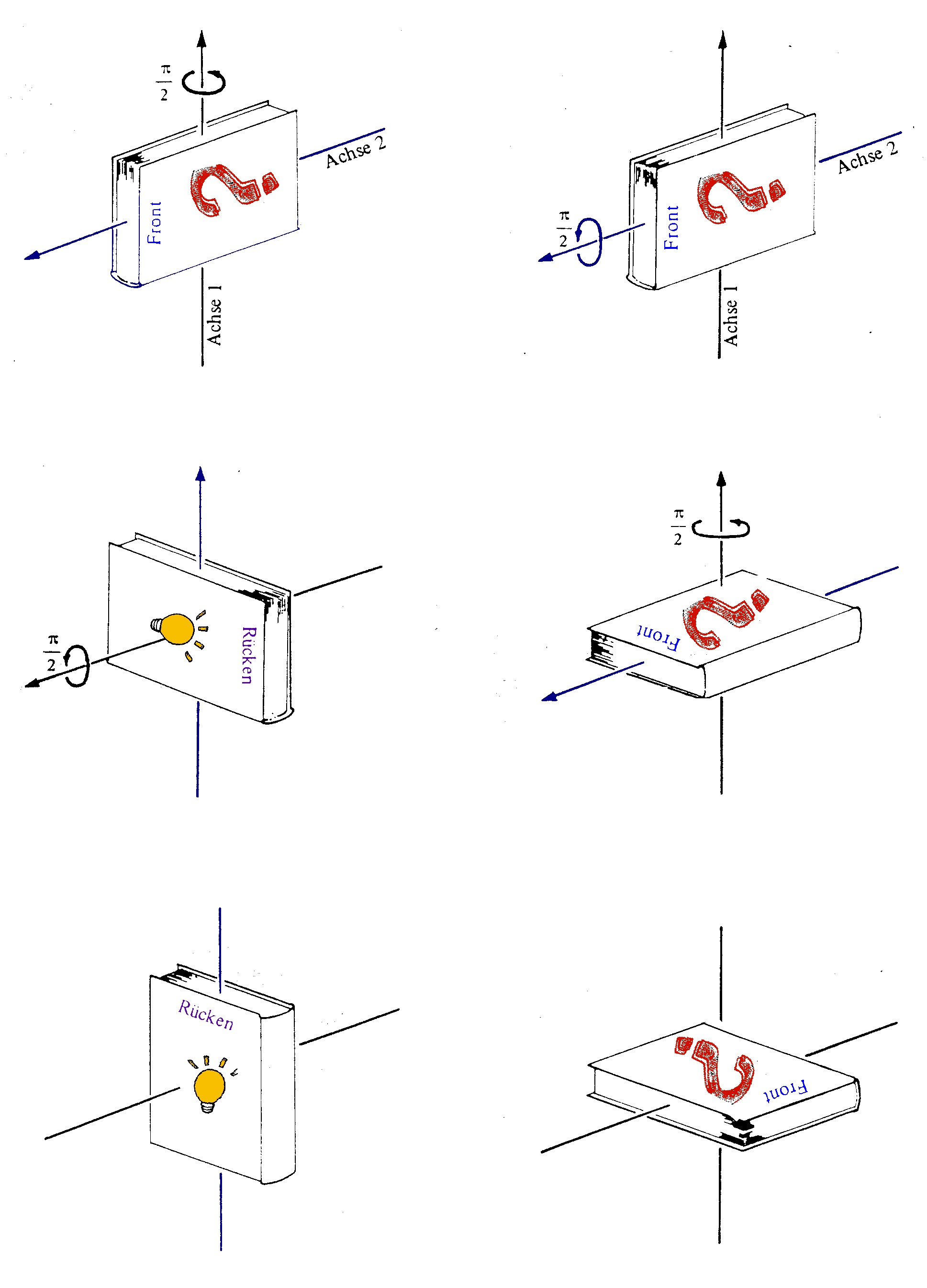 Anschaulich kann man die Änderung der Drehachsen mit der Drehung und das unterschiedliche Ergebnis nach einander ausgeführter Drehungen um 90° an einem Buch betrachten: