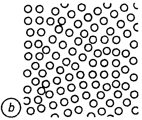 a') Festkörper mit makroskopisch unregelmäßige Strukturen und nur lokalen Regelmäßigkeiten. Sie werden amorphe Festkörper genannt, es besteht keine Fernordnung in diesen Körpern. Bsp: Glas, Zement
