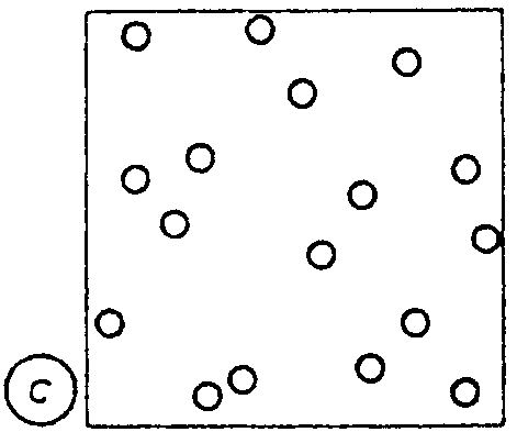 c) Durch weitere Wärmezufuhr werden die Bindungskräfte weitgehend aufgehoben. Die Temperatur erreicht die Siedetemperatur und die Bindeenergie und wird im Mittel sehr viel kleiner als die kinetische Energie: . Es entsteht ein Gas, dessen Atome (Moleküle) ungeordnet aneinander stoßen. Ein Gas hat weder eine feste Gestalt noch ein festes Volumen. Es gibt weder Nah- noch Fernordnung