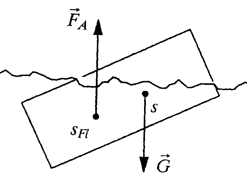 Betrachten wir jetzt noch einmal schwimmende Körper. Jeder an der Wasseroberfläche schwimmende Körper nimmt eine bestimmte Lage ein. Ein Stab, der senkrecht ins Wasser getaucht wird, fällt um. Ein Brett, das hochkannt eingetaucht wird, legt sich auf seine Seite. Offensichtlich nimmt jeder Körper eine Gleichgewichtslage beim Schwimmen ein. Versuchen wir nun, mit Hilfe der Betrachtung von Kräften, diese Gleichgewichtslage zu analysieren. Auf den Körper wirkt ein Kräftepaar, das aus Gewichtskraft und Auftrieb besteht. Am Schwerpunkt des Körpers zieht die Gewichtskraft senkrecht nach unten, im Schwerpunkt des verdrängte Wasser greift die gleich große Auftriebskraft an und zieht nach oben. Wir wissen, daß die Gewichtskraft und Auftrieb gleich groß sind. Damit sind die Bedingungen für ein Kräftepaar gegeben. Aus diesen Kräften resultiert ein Drehmoment. Beide Kräfte drehen deshalb den Körper.