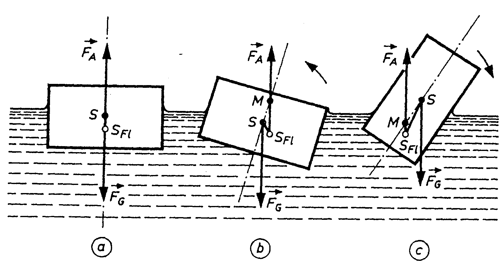 Ob eine Schwimmlage stabil oder labil ist, entscheidet man mit Hilfe eines neu eingeführten Zentrums, des Metazentrums. Befindet sich der schwimmende Körper in seiner Gleichgewichtslage, so liegen der Schwerpunkt des Körpers und der Schwerpunkt der verdrängten Flüssigkeit übereinander. Die Verbindungslinie der beiden Punkten denke man sich nun fest am Körper angeheftet. Liegt der schwimmende Körper nicht in seiner Gleichgewichtslage, so liegt diese Verbindung schräg. Liegt das Metazentrum oberhalb des Schwerpunkts, dann ist die ursprüngliche Schwimmlage stabil, anderenfalls ist sie labil. Es wirkt ein Drehmoment, der Körper wird in eine stabile Gleichgewichtslage gedreht.