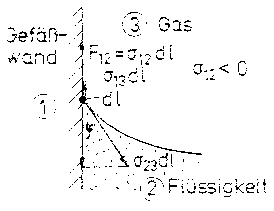 Dieses Phänomen betrachten wir nur in einem Beispiel. Hierzu überlegen wir uns, wie die Oberflächenspannung auf eine Oberfläche einer Flüssigkeit gegen eine Gasphase an einer Gefäßwand wirkt