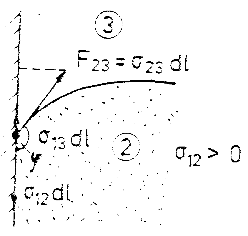 Nun betrachten wir das Linienelement dl der Begrenzungslinie zwischen den 3 Medien; an dieser Begrenzungslinie greifen 3 Kräfte an: