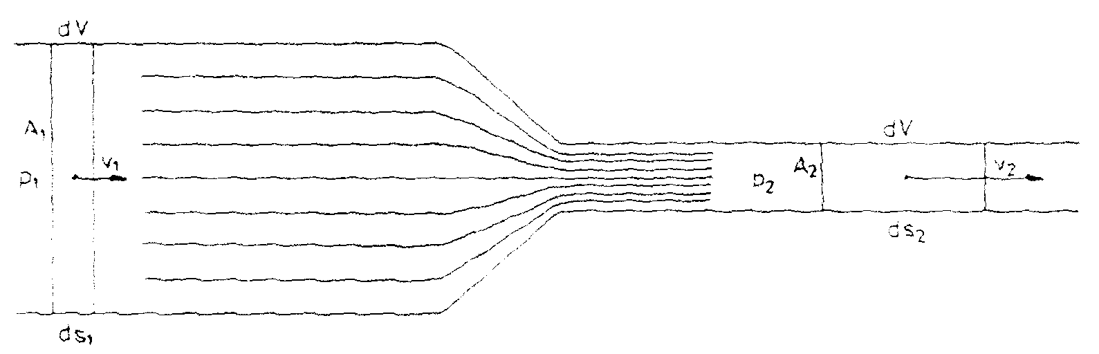 sei null. Betrachten wir nun eine Flüssigkeit , die durch einen Schlauch fließt, der sich verengt.