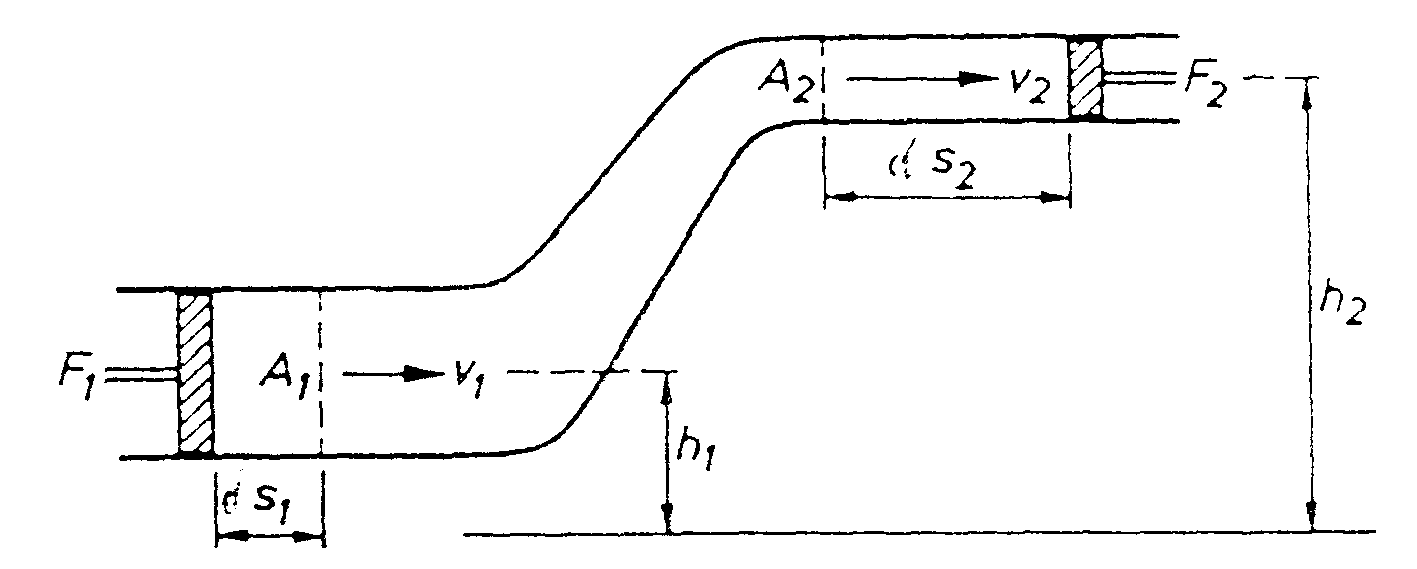 p = p2 - p1 berechnen zu können, betrachten wir wieder Volumenelemente einer Flüssigkeit in einem Schlauch mit sich verengendem Querschnitt. Zugleich wollen wir aber die Annahme fallenlassen, der Schweredruck sei vernachlässigbar. Wir setzen also voraus, der Schlauch steige um eine Höhe D