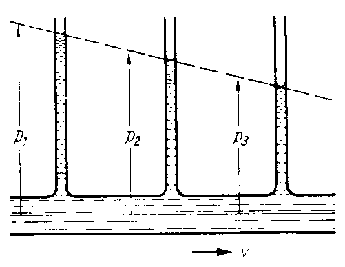An der Einschnürung eines von einer Flüssigkeit durchflossenen Rohres nimmt der hydrostatische Druck p also ab.