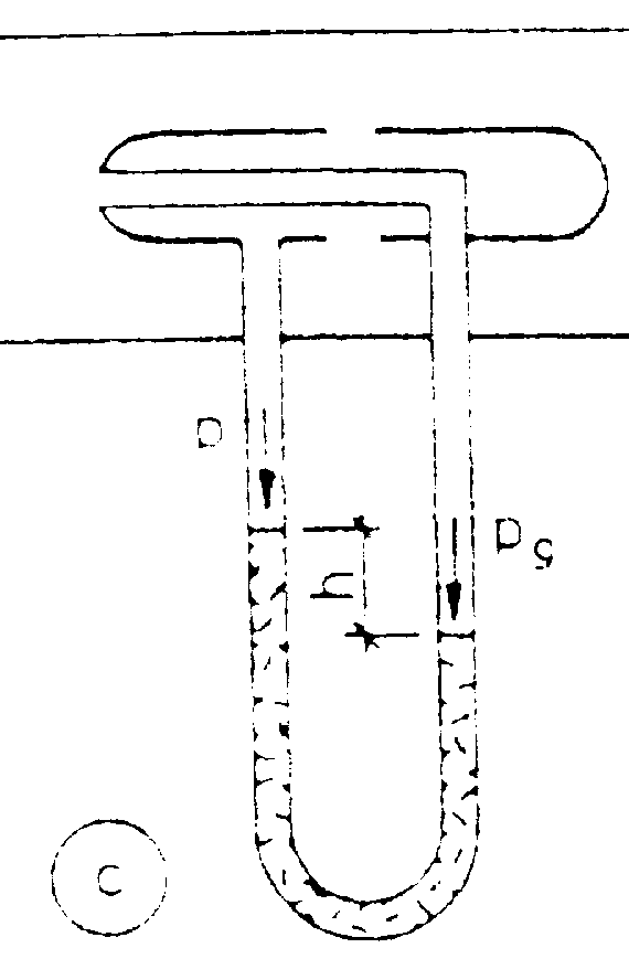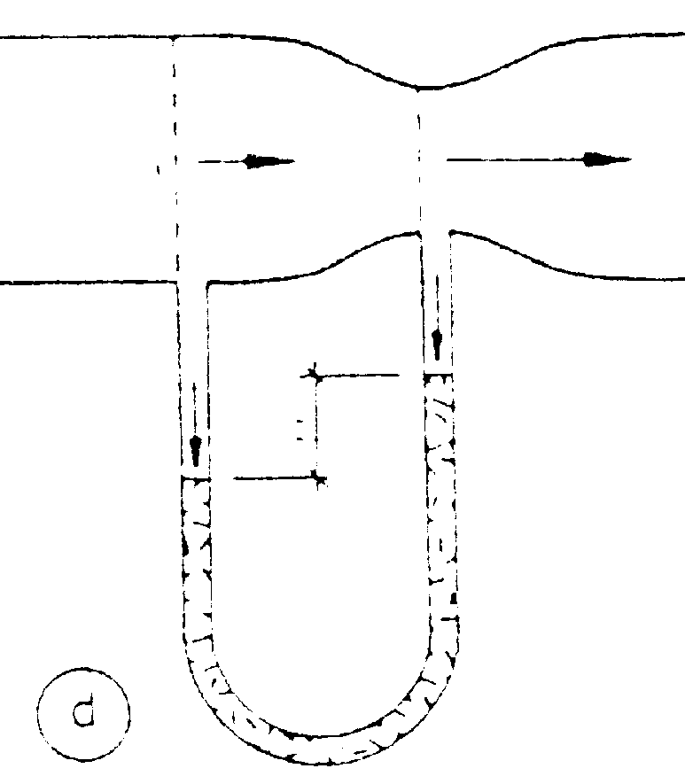 Mit Hilfe des Pilot Rohres (Bild b) mißt man den Druck im Staugebiet. Die Öffnung der Sonde ist vorn, wo die Stauung eintritt, so daß dort die Strömungsgeschwindigkeit v1 = 0 herrscht.