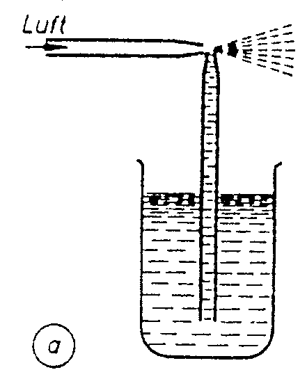 Zunächst betrachten wir noch einmal die Strömung durch ein horizontales Rohr mit Verengung. Wir hatten qualitativ ermittelt, daß der hydrostatische Druck in der Taille des Rohres am kleinsten sein muß, da die Strömungsgeschwindigkeit dort am größten ist. Um dies nun auch quantitativ zu messen, benutzen wir eine sogenannte Venturi - Düse. (Bild d) Diese Düse mißt die Durchflußrate. Die Messung der Druckdifferenz vor und in der Verengung genügt uns, um die Strömungsgeschwindigkeit berechnen zu können: