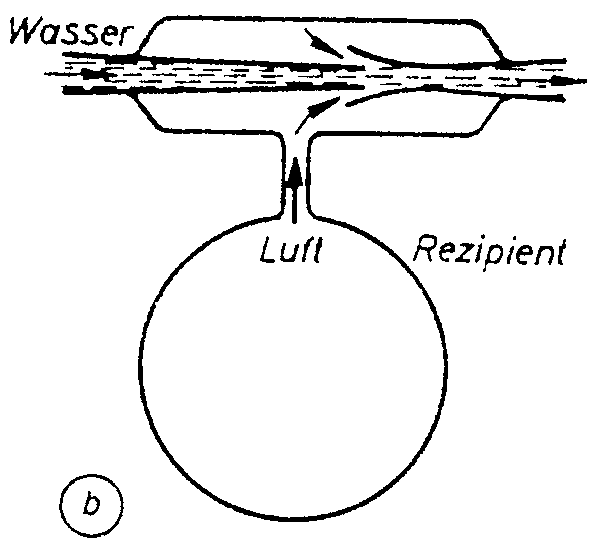 Dieses Prinzip wird in großem Umfang bei Wasserstrahlpumpen verwandt: Ein Wasserstrahl fließt hierbei durch eine Verengung und erzeugt damit einen Unterdruck. Von diesem Unterdruck angesaugt, steigt eine Flüssigkeit oder ein Gas aus einem Behälter nach oben. Wendet man dieses Prinzip auf ein mit Gas gefülltes Gefäß an, so erhält man eine einfache Vakuumpumpe.