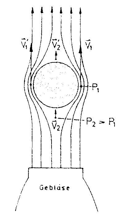 Der Styroporball wird im Luftstrahl durch Unterdruck stabilisiert da der Luftdruck p2, an der Stelle, an der sich die Luft unterhalb der Kugel staut, kleiner ist als der der vorbeifließenden Luft. So entsteht durch den Unterdruck eine Gleichgewichtslage, in die der Ball auch nach einer Ablenkung zurück fliegt. Auch in einem geneigten Luftstrom wird der Ball noch gehalten.