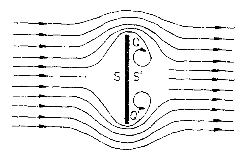 Wir hatten ebenfalls festgestellt, daß an einem Körper in einer strömenden Flüssigkeit eine Reibungswiderstand entsteht. Unmittelbar am Körper haftet die Flüssigkeit fest. Die relative Geschwindigkeit zwischen Körper und Flüssigkeit ist also dort null. In der Grenzschicht steigt die Geschwindigkeit auf den Wert der ungestörten Strömung. In dieser Grenzschicht entsteht durch die innere Haltung der Flüssigkeit der Reibungswiderstand.